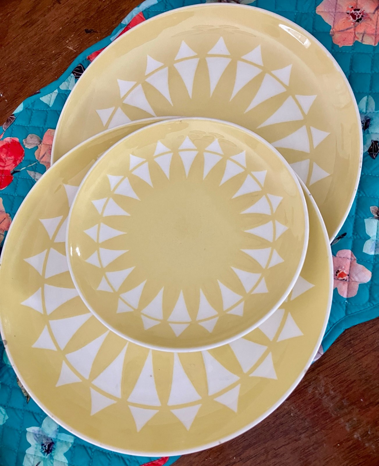 Vintage 1950s - two 10” dinner plates one 7” salad plate. By Harkerware in the "Sun Glow" pattern. Yellow with a white starburst or sun pattern. The plates are in good condition and are bright in color but there is some darker marks around the edges of the larger plates. The smaller plate has a small ding underneath. Please check photos carefully.