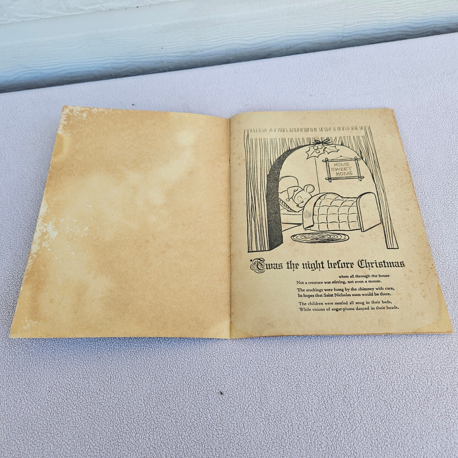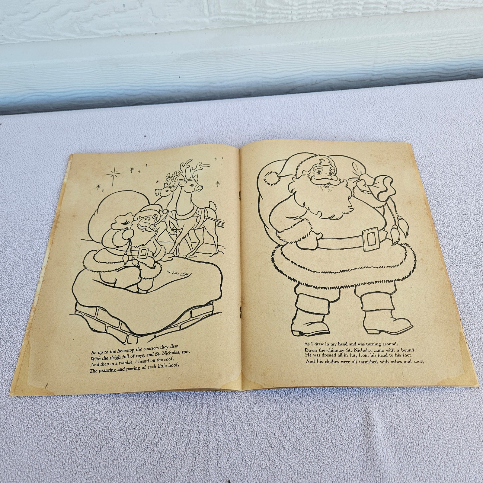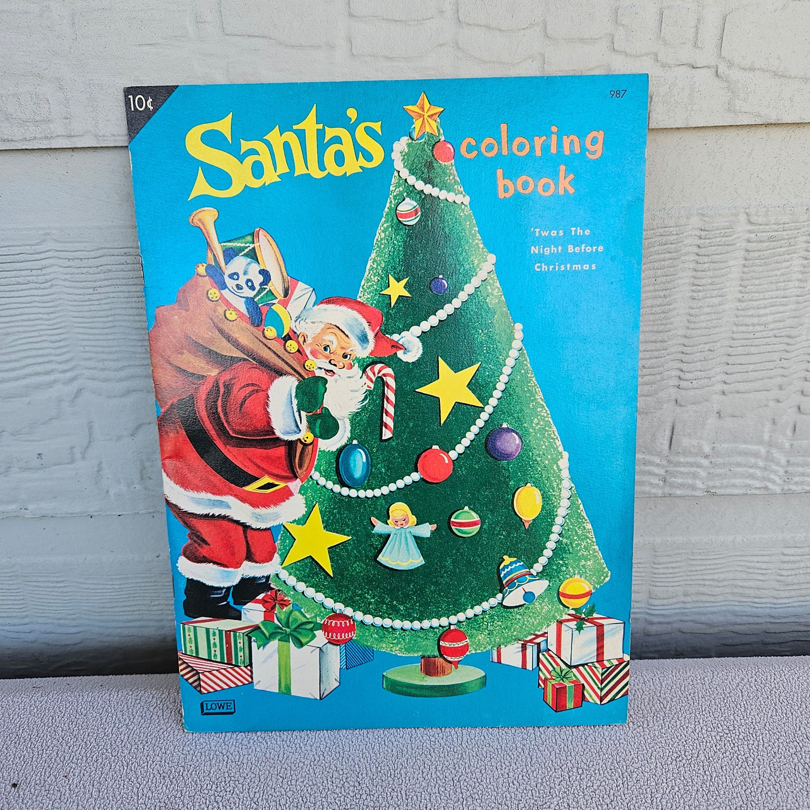 VTG Lowe 1960's Santa's Coloring Book Twas the Night Before Christmas Story. Brand new, never used but it is old and it does have shelf wear on the edges. discoloring to the pages, and what looks like "might' be moisture damage on the very corner edges (however, it is not wrinkled so it might be something else). Each page corresponds to a part of the Night Before Christmas poem. Smoke-free.